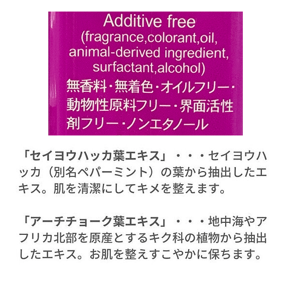 全成分/水、セイヨウハッカ葉エキス、アーチチョーク葉エキス、クダモノトケイソウ果実エキス、チャ葉エキス、グリチルリチン酸2k、乳酸、乳酸Na、BG、1,2‐ヘキサンジオール、フェノキシエタノール