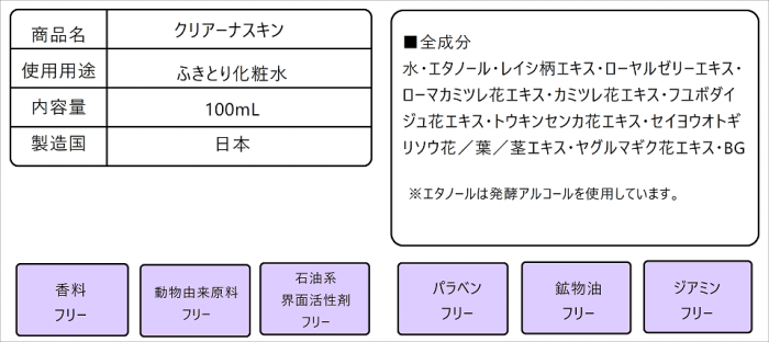 全成分/水・エタノール・レイシ柄エキス・ローヤルゼリーエキス・ローマカミツレ花エキス・カミツレ花エキス・フユボダイジュ花エキス・トウキンセンカ花エキス・セイヨウオトギリソウ花/葉/茎エキス・ヤグルマギク花エキス・BG